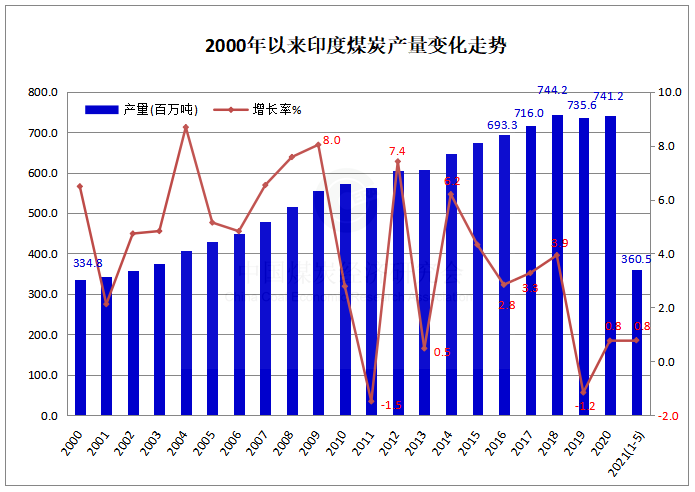 据印度煤炭部(Ministry of Coal)公布的初步统计数据, 2021年5月,印度煤炭(煤及褐煤)产量合计为5635万吨,比上年同期增加310万吨,同比增长5.8%,比4月份增加160万吨,环比增长2.9%。其中,国有印度煤炭公司(CIL)煤炭产量为4208万吨,同比增长1.7%;辛加瑞尼煤矿公司(SCCL)产量544万吨,同比增长68.42%;自用…