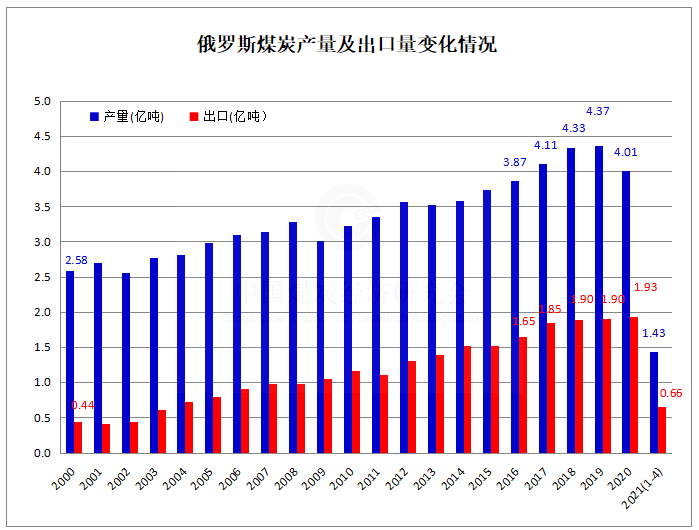 2021年1-4月俄罗斯煤炭产量和出口分别增长8.57%和17.57%