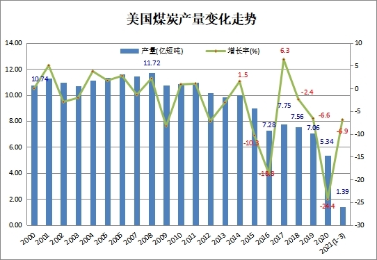 据美国能源信息署(EIA)发布的2021年4月份能源论评( Monthly Energy Review,April 2021)数据显示,2020年,美国煤炭产量为5.34亿短吨(以下计量单位相同,约合4.85亿吨),比上年减少1.72亿吨,同比下降24.4%;国内煤炭消费为4.77亿吨,比上年减少1.09亿吨,同比下降18.6%;煤炭出口6907…