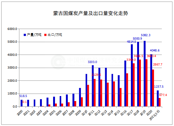 2021年一季度蒙古国煤炭产量和出口分别增长53.1%和115.8%