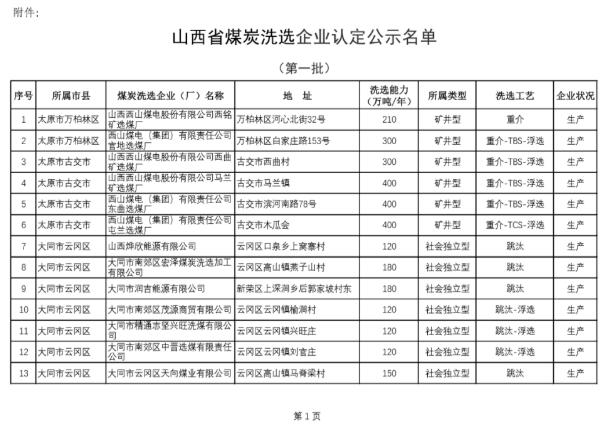 第一批山西煤炭洗选企业认定名单公布