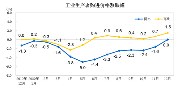 2020年12月份,全国工业生产者出厂价格同比下降0.4%,环比上涨1.1%;工业生产者购进价格同比持平,环比上涨1.5%。2020年全年,工业生产者出厂价格比上年下降1.8%,工业生产者购进价格下降2.3%。