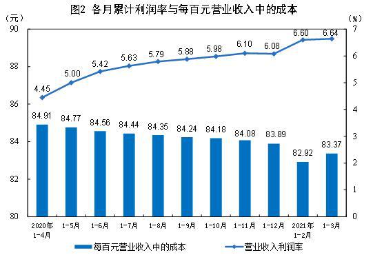 1—3月份,规模以上工业企业每百元营业收入中的成本为83.37元,同比减少1.36元;每百元营业收入中的费用为8.60元,同比减少1.04元。