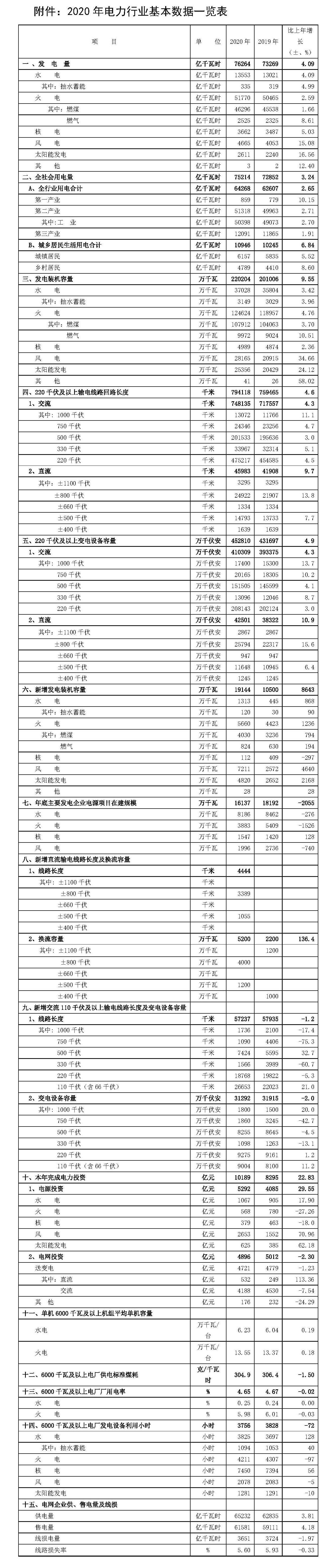 ?、?nbsp; 2020年电力数据均来自中电联2020年度统计数据(简称“年报数据”),数据因四舍五入的原因存在总计与分项合计不等的情况,后同。