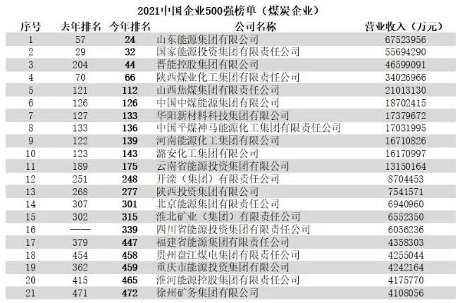 21家煤炭企业上榜2021中国企业500强