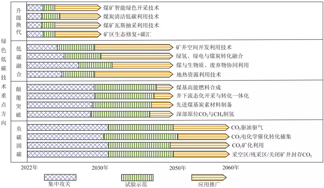 创新绿色低碳技术不仅是当前煤炭行业转型发展的需要,也是国际竞争的热点。结合短期与中长期目标,统筹稳增长与调结构,围绕升级换代、低碳融合、颠覆突破、负碳固碳四大技术类型,提出煤炭未来的绿色低碳科技创新重点方向。根据煤炭行业绿色低碳技术发展现状与态势,现有低碳升级技术在2025年左右可实现规?;τ猛乒?。2025年前,主要进行低碳融合技术与负碳技术的攻关;2025—2030年,开展技术试验与示范,并根据技术成熟度和减碳需求适时规?;τ猛乒?;2030年前,主要目标是完成重大颠覆突破技术的集中攻关和试验示范;2030年后,取得突破的技术进行规模应用,实现大规模减碳,为2060年实现碳中和奠定基础。