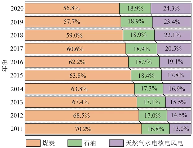 当前煤炭生产与消费占比高,这是基于我国资源赋存条件、开发难易程度、生产消费成本、运输储存使用条件等因素综合作用的历史选择。煤炭占化石能源矿产资源已探明储量的94%以上,石油和天然气仅占6%左右,这种资源禀赋条件使得我国的基础能源严重依赖煤炭,在相当长的一段时期内,煤炭仍将是我国能源安全的稳定器和压舱石。