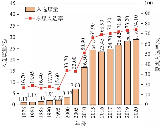 ▲1978—2020年原煤入选率和入选煤量