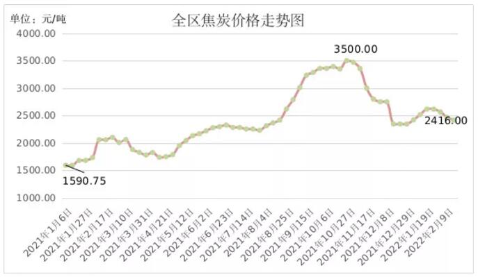 受需求低迷影响,本周内蒙古焦炭价格继续下降。2月16日,全区焦炭平均出厂价格为2416.00元/吨,环比下降2.03%,同比上涨17.44%。