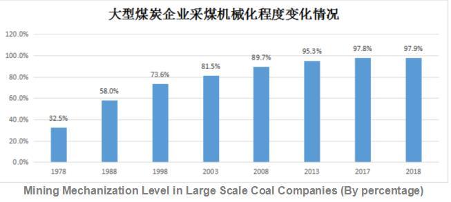 煤炭生产方面,从1978年至2019年,大型煤炭企业采煤机械化程度由32%提高到96%;全国煤矿人均生产效率由137吨/年提高到1000吨/年;建成了年产120万吨及以上的大型现代化煤矿1200处左右,煤炭产量占全国的80%以上;建成了千万吨级煤矿42处,产能6.7亿吨/年。